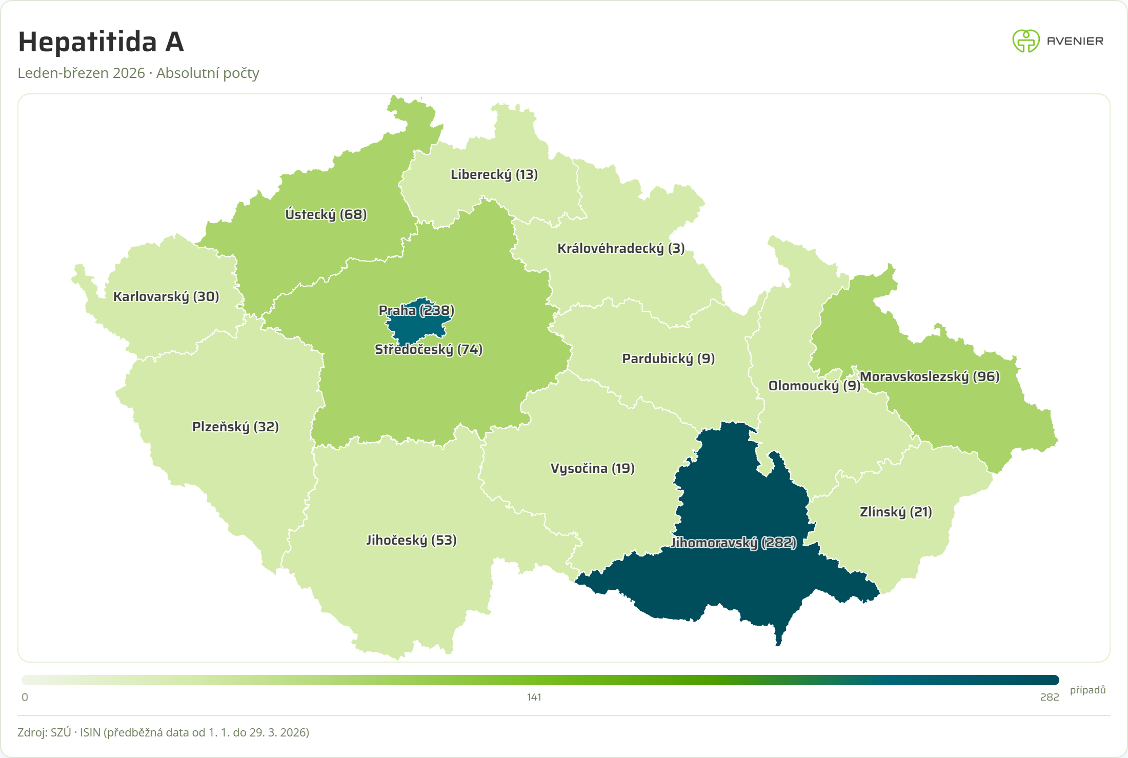 Epidemie virové hepatitidy typu A nekončí – v roce 2025 se nakazilo celkem 3 255 osob a za období leden-březen 2026 se nakazilo celkem už 899 osob. Pro srovnání – v letech 2018-2024 byl průměrný počet nakažených osob okolo 230 ročně.