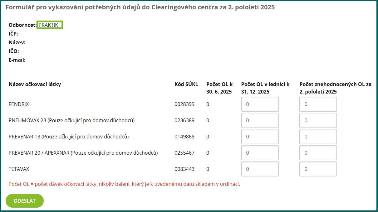 ✓ Pole: Počet OL v lednici k 31. 12. 2025 – zde vyplňte aktuální počet dávek OL (nikoliv balení) v lednici ke dni 31. 12. 2025.